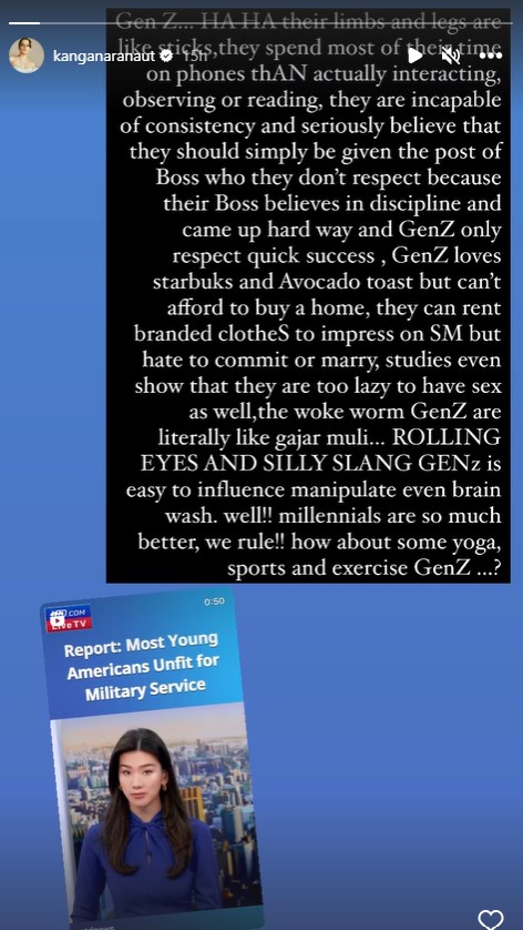 कंगना ने इसी जेनरेशन को 'गाजर-मूली' की तरह बताया है। उन्होंने इंस्टाग्राम स्टोरी पर इस जेनरेशन के बारे में कहा,'जेन जेड वह है जिनके अंग और पैर लकड़ी की तरह हैं, वह अपना ज्यादातर वक्त फोन पर बिताते हैं बजाय लोगों से बातचीत करने या रीडिंग के, वह किसी भी स्थिरता के काबिल नहीं और यह मानकर चलते हैं कि उन्हें बॉस की पोजिशन मिलनी चाहिए जिन्हें वह खुद कोई इज्जत नहीं देते क्योंकि उनका बॉस डिसिप्लिन में यकीन रखता है और इस पोजिशन तक आने के लिए कड़ी मेहनत की है और जेन जेड को जल्दबाजी में सफलता चाहिए होती है।'