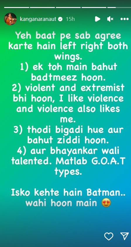 अपने बारे में कही गई ऐसी बात सुन खुशी से गदगद हुई कंगना ने कहा, "इस बात से सब सहमत होते हैं लेफ्ट राइट दोनों विंग।" इसके बाद चार प्वाइंट्स में कंगना ने अपनी खूबियां गिनाईं।