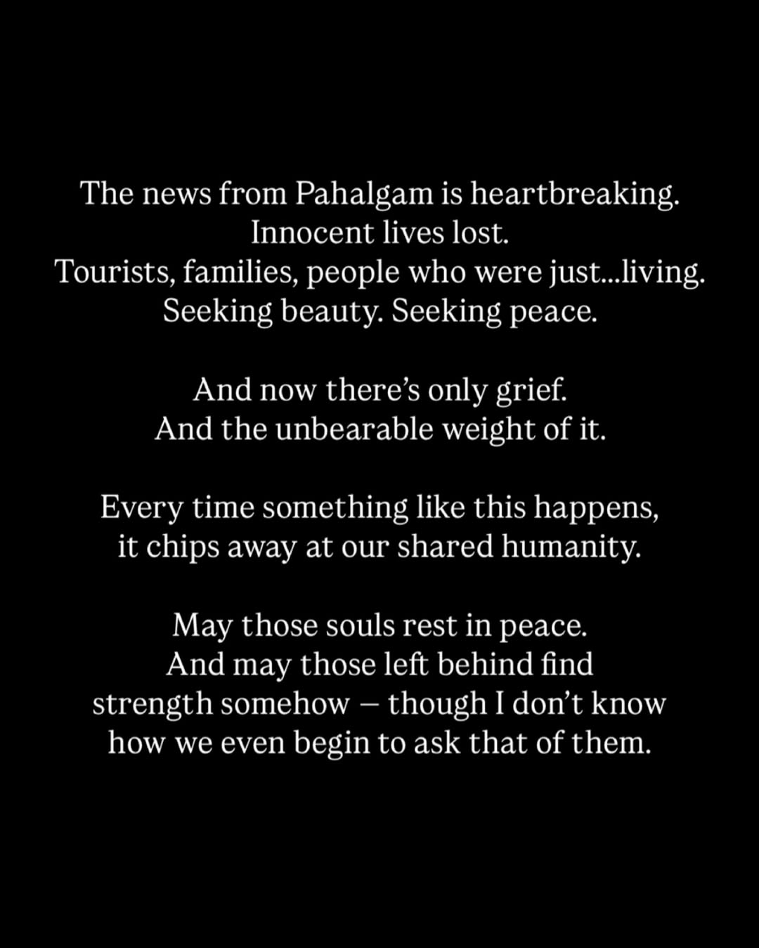 आलिया भट्ट ने हमले पर रिएक्ट करते हुए लिखा, ‘पहलगाम से खबर दिल दहला देने वाली है। निर्दोष लोगों की जान चली गई। टूरिस्ट्स, परिवार, लोग जो बस…जी रहे थे। खूबसूरती की तलाश। शांति ढूंढ रहे थे और अब सिर्फ दुख ही दुख है और इसका असहनीय वजन। जब भी ऐसा कुछ होता है, तो ये हमारी मानवता को खत्म करता है। उन आत्माओं को शांति मिले और जो लोग पीछे रह गए हैं उन्हें किसी तरह शक्ति मिले।’