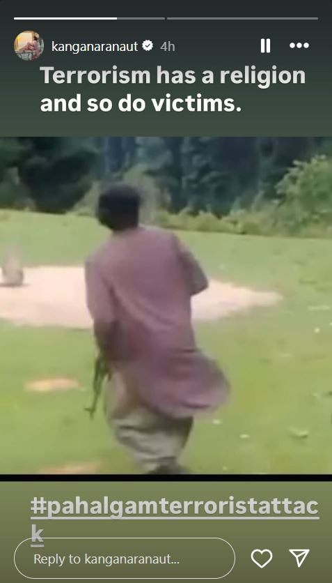बॉलीवुड एक्ट्रेस और बीजेपी सांसद कंगना रनौत ने इस आतंकी हमले पर तीखी प्रतिक्रिया दी है। उन्होंने अपनी इंस्टाग्राम स्टोरी पर दो पोस्ट शेयर किए। पहले पोस्ट में कंगना ने घटना का वीडियो शेयर करते हुए लिखा, "आतंकवाद का धर्म होता है और पीड़ितों का भी।" दूसरे पोस्ट में उन्होंने लिखा, "निहत्थे और निर्दोष लोगों को निशाना बनाना पूरी तरह से निंदनीय है।" कंगना ने इस हमले को डरावना बताया और सरकार से कश्मीर में मजबूत सुरक्षा व्यवस्था की मांग की।