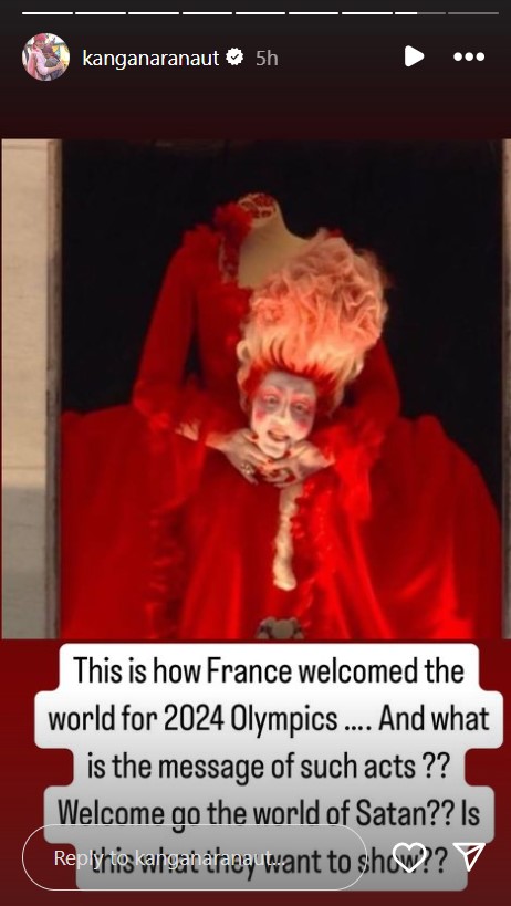 कंगना यहीं नहीं रुकीं। उन्होंने एक अन्य तस्वीर शेयर की, जिसमें गर्दन को हाथ में पकड़े एक महिला खड़ी है। इसे लेकर एक्ट्रेस ने लिखा, 'क्या इसी तरह फ्रांस ने ओलंपिक 2024 का स्वागत किया...और इस तरह के एक्ट्स का संदेश क्या है?? सैटन की दुनिया में आपका स्वागत है? क्या वह यही दिखाना चाहते हैं?'