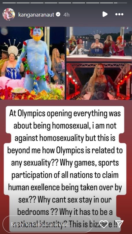 कंगना ने एक फोटो कोलाज शेयर करते हुए अपनी बात को इस नोट पर खत्म किया कि ओलंपिक की ओपनिंग सेरेमनी में सब कुछ पर होमोसेक्शुअलिटी पर आधारित था।