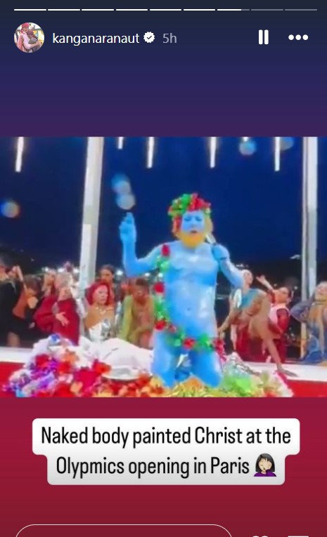 कगंना ने वह फोटो भी शेयर की, जिसमें एक व्यक्ति नीले रंग से पेंटेड है। एक्ट्रेस ने लिखा, 'पेरिस ओलंपिक की ओपनिंग सेरेमनी में बिना कपड़ों के इस व्यक्ति को ईसा मसीह दिखाया गया है।'