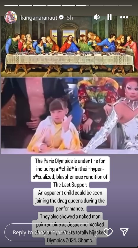 सोशल मीडिया पर ओलंपिक सेरेमनी से कुछ तस्वीरें शेयर कर कंगना ने बताया कि इसमें उन्हें क्या नहीं अच्छा लगा। कंगना ने सेरेमनी के तमाम इवेंट्स में से एक 'द लास्ट सपर' एक्ट के फोटो और वीडियो शेयर किए। उन्होंने एक बच्चे को शामिल किए जाने पर आपत्ति जताई।