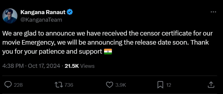 कंगना रनौत ने अपने आधिकारिक एक्स अकाउंट पर एक पोस्ट शेयर करते हुए लिखा, "मुझे ये बताते हुए बेहद ही खुशी हो रही है कि हमारी फिल्म 'इमरजेंसी' को सेंसर बोर्ड की तरफ से सर्टिफिकेट मिल गया है। हम फिल्म की रिलीज डेट की घोषणा जल्द करेंगे। आप सभी के जोश और सपोर्ट के लिए बहुत-बहुत धन्यवाद"।