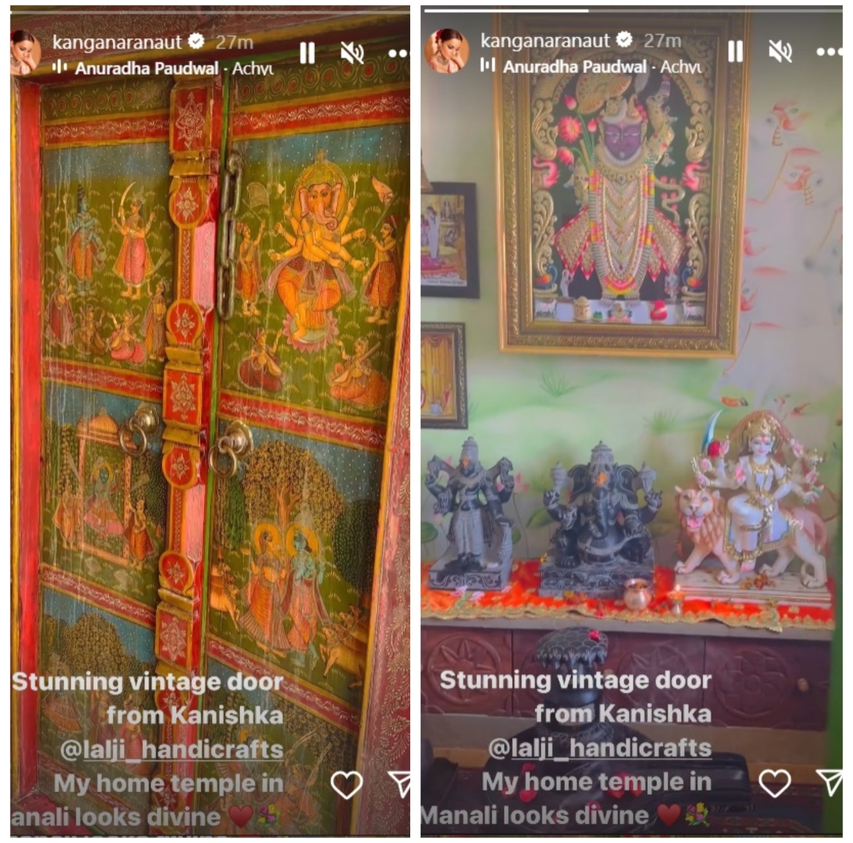 एक्ट्रेस ने अपने इंस्टा स्टोरी पर मनाली वाले घर के मंदिर की एक झलक दिखाई, जिसमें उन्होंने बड़े से शिवलिंग की स्थापना की है। इतना ही नहीं उन्होंने अपने घर के मंदिर में एक रंगीन विंटेज दरवाजा भी लगवाया है, जो बेहद खूबसूरत है। कैप्शन में एक्ट्रेस ने लिखा कंगना, “कनिष्क @lalji_handicrafts का आश्चर्यजनक विंटेज दरवाजा। मनाली में मेरे घर का मंदिर दिव्य दिखता है।