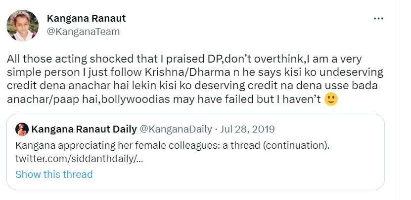 कंगना रनोट ने 15 मार्च को एक ट्वीट करते हुए कहा, "वो सभी लोग जो शॉक्ड होने की एक्टिंग कर रहे हैं कि मैंने डीपी की तारीफ की, ज्यादा न सोचें, मैं बहुत ही साधारण इंसान हूं। मैं बस कृष्णा/ धर्म को मानती हूं और वो कहता है कि किसी को फालतू में क्रेडिट देना अनाचार है, लेकिन किसी को अच्छा काम करने पर भी क्रेडिट न देना उससे बड़ा अनाचार/ पाप है, बॉलीवुड वाले शायद फेल हो गए है, लेकिन मैं नहीं हुई हूं।"
