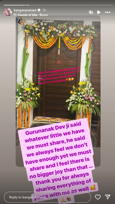 कंगना रनौत ने पोस्ट पर जवाब देते हुए कहा, "गुरु नानक देव जी ने कहा कि हमारे पास जो कुछ भी है, हमें उसे शेयर करना चाहिए, उन्होंने कहा कि हमें हमेशा लगता है कि हमारे पास पर्याप्त नहीं है, फिर भी हमें शेयर करना चाहिए और मुझे लगता है कि इससे बड़ी कोई खुशी नहीं है...आपको हमेशा अपनी हर चीज मेरे साथ शेयर करने के लिए धन्यवाद।"