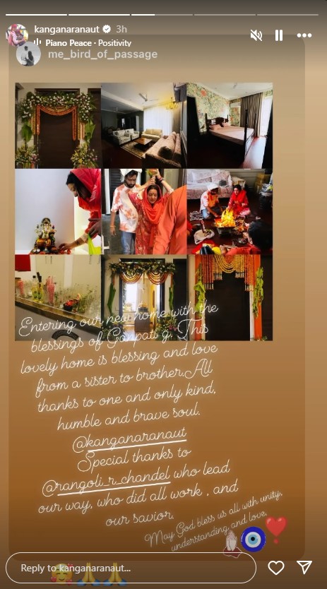 कंगना रनौत का भाभी अंजलि रनौत ने भी शुक्रिया अदा किया। उन्होंने गृह प्रवेश की फोटो शेयर करते घर के अलग- अलग हिस्सों की एक झलक दिखाई। इसमे बेडरूम, ड्राइंग रूम, पूजा घर और मेन गेट शामिल की तस्वीरें शामिल हैं।