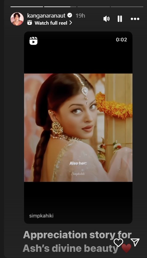 कंगना रनोट ने 'हम दिल दे चुके सनम' से ऐश्वर्या के कुछ क्लिप्स शेयर किए। इसके साथ ही उन्होंने लिखा, 'ऐश की डिवाइन खूबसूरती के लिए एप्रिसिएशन स्टोरी।' बता दें कि इसके पहले भी कुछ मौकों पर कंगना ने ऐश्वर्या की तारीफ की है। उन्होंने ऐश्वर्या राय को एक बार चांद तक कहा था।