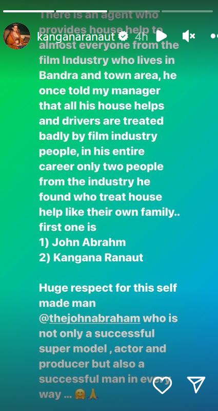 कंगना रनोट यहीं नहीं रुकीं, उन्होंने जॉन अब्राहम को सक्सेसफुल इंसान बताया। उन्होंने अपने दूसरे पोस्ट में लिखा, "एक एजेंट है, जो फिल्म इंडस्ट्री से जुड़े लगभग सभी लोगों के लिए हाउस स्टाफ प्रोवाइड कराता है। उसने मेरे मैनेजर से एक बार कहा था कि सभी हाउस हेल्प और ड्राइवरों के साथ फिल्म इंडस्ट्री के लोग बुरा व्यवहार करते हैं।"