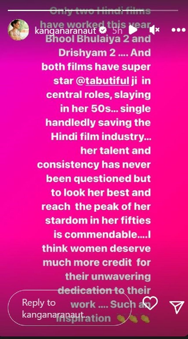 रविवार को कंगना रनोट ने इंस्टाग्राम पर एक पोस्ट शेयर किया है। इसमें उन्होंने लिखा है कि तब्बू बॉलीवुड की उन दो फिल्मों में है, जो दोनों ही फिल्में इस वर्ष सफल रही है। कंगना रनोट ने यह भी कहा कि तब्बू स्टारडम के पीक पर अपने उम्र के 50 वर्ष पूरे करने के बाद पहुंची हैं। गौरतलब है कि तब्बू की उम्र 52 वर्ष है। कंगना रनोट ने यह भी कहा कि तब्बू इस समय बहुत अच्छा कर रही है। वह कहती हैं, 'इस वर्ष 2 फिल्मों ने बहुत अच्छा किया है। पहली है भूल भुलैया 2 और दूसरी है दृश्यम 2। दोनों ही फिल्मों में तब्बू की अहम भूमिका है, जो 50 की उम्र पार करने के बाद भी बहुत अच्छा काम कर रही हैं। उनकी टैलेंट और कंसिस्टेंसी का कोई जवाब नहीं। वह अपने बेस्ट और करियर की स्टारडम की पीक पर पहुंची है।'