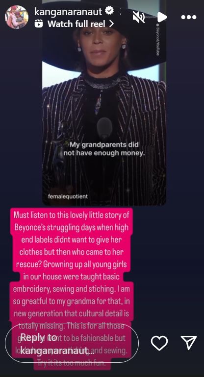 बियॉन्से के संघर्ष की कहानी सुन कंगना रनौत इमोशनल हो गईं और उन्होंने लोगों से उनकी स्ट्रगल स्टोरी सुनने की सलाह दी। कंगना ने वीडियो रीशेयर करते हुए लिखा, "बियॉन्से के संघर्ष के दिनों की ये छोटी प्यारी सी कहानी सुनना चाहिए, जब बड़े-बड़े लेबल्स ने उन्हें कपड़े देने से मना कर दिया था लेकिन उन्हें बचाने कौन आया?"
