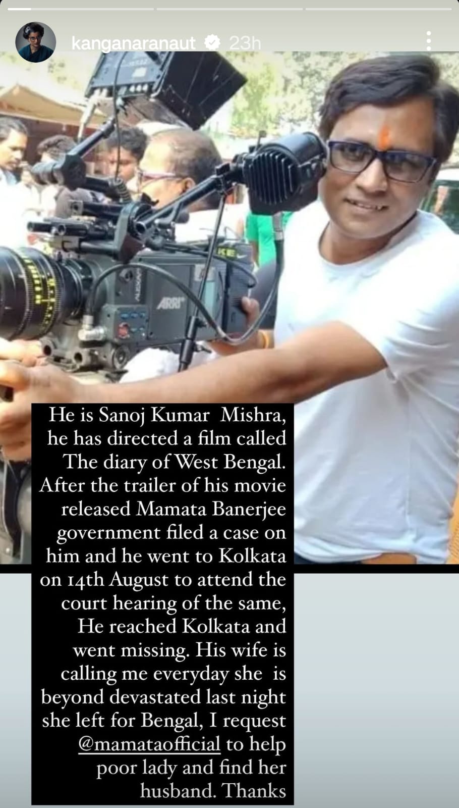 बुधवार को कंगना रनौत ने इंस्टाग्राम स्टोरी पर सनोज मिश्रा की एक तस्वीर शेयर करते हुए लिखा था- ये सनोज कुमार मिश्रा हैं, जिन्होंने 'द डायरी ऑफ वेस्ट बंगाल' नाम की फिल्म को डायरेक्ट किया है। इस फिल्म का ट्रेलर रिलीज होने के बाद ममता बनर्जी सरकार ने इन पर केस कर दिया था।