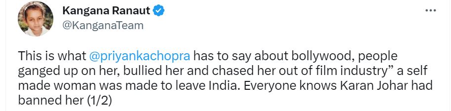 कंगना रनोट और प्रियंका चोपड़ा फिल्म फैशन में साथ काम कर चुके हैं। एक्ट्रेस ने हाल ही में दिए गए प्रियंका चोपड़ा के इंटरव्यू पर रिएक्ट करते हुए अपने ऑफिशियल ट्विटर हैंडल से पोस्ट किया, 'बॉलीवुड के बारे में प्रियंका चोपड़ा का यही कहना है, लोगों ने उनके साथ गैंग अप किया, उन्हें धमकाया और फिल्म उद्योग से बाहर कर दिया, एक स्व-निर्मित महिला को भारत छोड़ने के लिए मजबूर किया गया। सभी जानते हैं कि करण जौहर ने उन्हें बैन कर दिया था।'