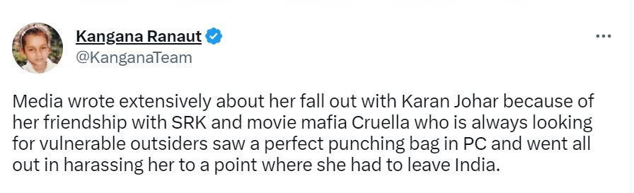 कंगना ने एक अन्य ट्विट में आगे लिखा, 'मीडिया ने करण जौहर के साथ उनके पतन के बारे में बड़े पैमाने पर लिखा, क्योंकि शाहरुख और मूवी माफिया क्रुएला के साथ उनकी दोस्ती थी, जो हमेशा कमजोर बाहरी लोगों की तलाश में रहते थे, उन्होंने पीसी में एक सही पंचिंग बैग देखा और उन्हें इस हद तक परेशान किया कि उन्हें भारत छोड़ना पड़ा।'