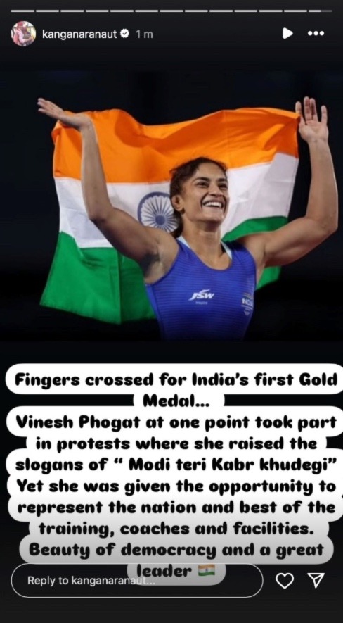इस मौके पर अभिनेत्री कंगना रनौत ने विनेश की इस जीत पर तंज कसते हुए उन्हें बधाई दी। कंगना ने लिखा, "इंडिया के पहले गोल्ड मेडल के लिए फ्रिंगर क्रॉस। विनेश फोगाट ने एक समय कभी विरोध प्रदर्शनों में हिस्सा लिया था, जिनमें ‘मोदी तेरी कब्र खुदेगी’ जैसे नारे लगाने के बाद भी उन्हें यह मौका दिया गया कि वह अपने देश का प्रतिनिधित्व करे। उन्हें बेस्ट ट्रेनिंग, कोच और सुविधाएं मिलीं। यहीं लोकतंत्र और एक महान नेता की खूबसूरती है।"