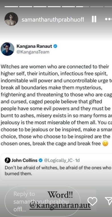 एक एक्स यूजर ने पोस्ट किया, ''चुड़ैलों से नहीं, उनसे डरिये, जिन्होंने उन्हें जलाया है।'' इस पर 'क्वीन' एक्ट्रेस ने रिप्लाई में बताया है कि असल में चुड़ैल किसे कहा जाता है। उन्होंने जो पोस्ट किया, साउथ स्टार सामंथा रुथ प्रभु (Samantha Ruth Prabhu) उस पर उनकी तारीफ किए बिना खुद को रोक नहीं पाईं।