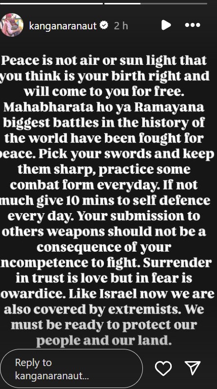 कंगना ने अपने पोस्ट में आगे लिखा कि भरोसे में समर्पण करना प्यार है, लेकिन डर में कायरता है। इजराइल की तरह अब हम भी चरमपंथियों के घेरे में हैं। हमें अपनी जमीन पर लोगों की रक्षा के लिए तैयार रहना चाहिए। बता दें कि कई लोग कंगना रनौत के इस पोस्ट को बांगलादेश में चल रहे विवाद को भी जोड़कर देख रहे हैं।