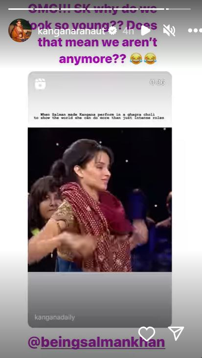 इंस्टाग्राम स्टोरी पर कंगना रनोट ने एक थ्रोबैक वीडियो रीशेयर किया है, जो सलमान खान के रियलिटी शो 'दस का दम' का है। क्लिप में देखा जा सकता है कि एक सेगमेंट में कंगना घाघरा-चोली पहनकर माधुरी दीक्षित और अनिल कपूर की फिल्म 'बेटा' के गाने 'धक धक करने लगा' पर डांस करती हुई नजर आ रही हैं।