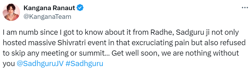 सद्गुरु जग्गी वासुदेव की 17 मार्च को दिल्ली के अपोलो अस्पताल में ब्रेन सर्जरी की गई है। उनका एक वीडियो शेयर करते हुए कंगना ने अपने सोशल मीडिया हैंडल एक्स पर लिखा, "जब से मुझे राधे से इसके बारे में पता चला, मैं स्तब्ध हूं। सदगुरु ने उस असहनीय दर्द में न केवल विशाल शिवरात्रि कार्यक्रम की मेजबानी की, बल्कि किसी भी बैठक या शिखर सम्मेलन को छोड़ने से भी इनकार कर दिया। जल्दी ठीक हो जाओ, हम आपके बिना कुछ भी नहीं हैं"।