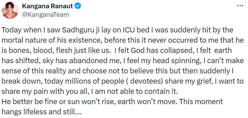इसके बाद कंगना ने एक और पोस्ट किया, जिसमें उन्होंने लिखा कि आज जब मैंने सद्गुरु को आईसीयू बिस्तर पर लेटे हुए देखा, तो मुझे अचानक उनके अस्तित्व की नश्वरता का एहसास हुआ, इससे पहले मुझे कभी यह ख्याल नहीं आया था कि वह हमारे जैसे ही हड्डियां, खून, मांस हैं। मुझे लगा कि पृथ्वी हिल गई है, आकाश ने मुझे छोड़ दिया है, मुझे लगता है कि मेरा सिर घूम रहा है, मैं इस वास्तविकता को समझ नहीं पा रही हूं।