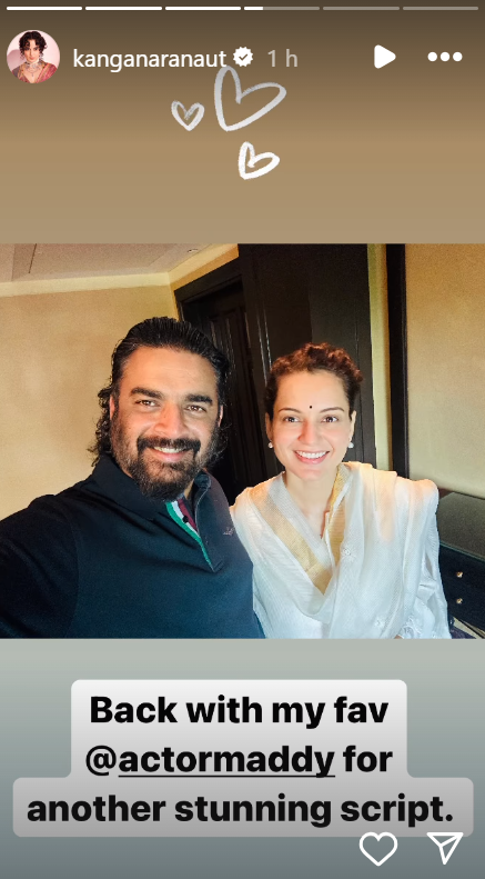 कंगना रनोट ने आज 12 फरवरी को अपने सोशल मीडिया हैंडल इंस्टाग्राम की स्टोरी पर एक तस्वीर शेयर की है। इसमें वह अभिनेता आर माधवन के साथ दिखाई दे रही हैं। इस फोटो को शेयर करते हुए एक्ट्रेस ने कैप्शन में लिखा, 'एक और शानदार स्क्रिप्ट के लिए अपने पसंदीदा आर माधवन के साथ वापस आ गई हूं'।
