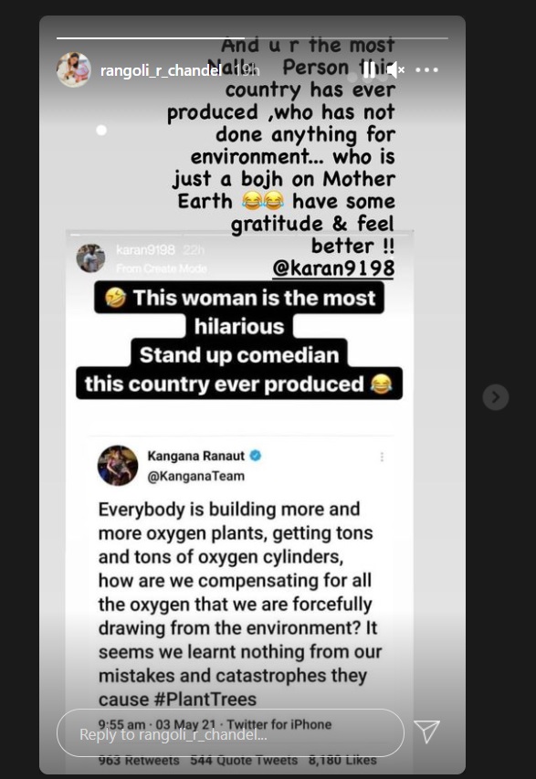 अब रंगोली ने करण के पोस्ट के जवाब दिया है। रंगोली ने अपनी इंस्टा स्टोरी पर करण को टैग करते हुए लिखा, ‘तुम इस देश के सबसे बड़े नल्ले इंसान हो। जिसने कभी पर्यावरण के लिए कुछ नहीं किया। जो इस धरती मां पर भी बोझ है। अपने अंदर थोड़ी अच्छी भावना लाओ और अच्छा महसूस करो’।