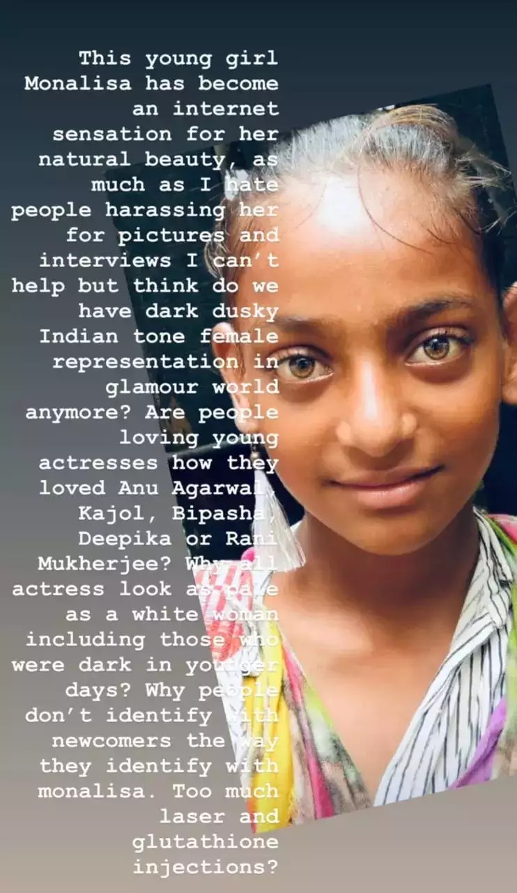 उन्होंने अपनी इंस्टाग्राम स्टोरीज में मोनालिसा की फोटो शेयर करते हुए लिखा ,"यह एक युवा लड़की मोनालिसा अपनी नेचुरल ब्यूटी की वजह से इंटरनेट सेंसेशन बन गई है। मैं उन लोगों से सख्त नफरत करती हूं जो इसे फोटोज और इंटरव्यू के लिए परेशान कर रहे हैं। मैं यह सोचने से खुद को नहीं रोक सकती कि क्या ग्लैमर वर्ल्ड में हमारे पास सांवले रंग वाली भारतीय सुंदरता है? क्या लोग युवा अभिनेत्रियों को उसी तरह पसंद करते हैं जैसे वो अनु अग्रवाल, काजोल, बिपाशा बसु, दीपिका और रानी मुखर्जी को करते थे?