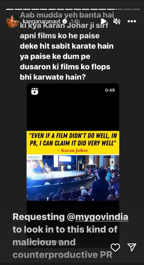इसके बाद कंगना ने एक और वीडियो शेयर किया, जिसपर उन्होंने लिखा, ''अब मुद्दा ये बनता है कि क्या करण जौहर जी सिर्फ अपनी फिल्मों को ही पैसे के दम पर हिट करवाते हैं या पैसे के दम पर दूसरों की फिल्म्स को फ्लॉप भी करवाते हैं।'' उन्होंने मुख्यमंत्री योगी आदित्यनाथ से अपील की कि इस तरह के गलत पीआर पर गौर किया जाए।