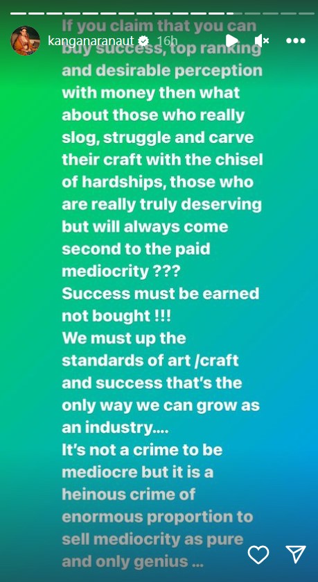 एक अन्य पोस्ट में कंगना ने कहा, ''घृणित काम करना कोई क्राइम नहीं है, बल्कि लोगों के परसेप्शन को बदलने के लिए अच्छे को खराब और खराब को अच्छा करना राक्षसी और दुर्भावनापूर्ण काम है...हिंदी फिल्म इंडस्ट्री एक डूबते जहाज की तरह है, हमें इसकी जरूरत है। अपने अंदर गहराई से देखें और देखें की हमारे अपने जहाज में छेद की क्या वजह है...उम्मीद है कि बेहतर समझ आएगी, सही काम करने के लिए अभी देर नहीं हुई।''