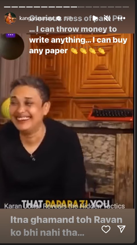 कंगना रनोट ने इंस्टा स्टोरी पर करण जौहर पर पेड पीआर करवाकर अपनी फिल्मों के लिए अच्छे रिव्यू छपवाने का आरोप लगाया है। इतना ही नहीं, बल्कि एक्ट्रेस ने और भी कई पोस्ट शेयर कर उनके बारे में और भी बहुत कुछ कहा है। एक्ट्रेस ने करण के पुराने बयान का वीडियो क्लिप शेयर किया, जिसमें करण कहते हैं कि वह कुछ भी लिख सकते हैं। इस पर कंगना ने कहा, ''करण जौहर जी कह रहे हैं कि मैं पैसे फेंककर कुछ भी कर सकता हूं...मैं कोई भी पेपर खरीद सकता हूं...इतना घमंड को रावण को भी नहीं था।''