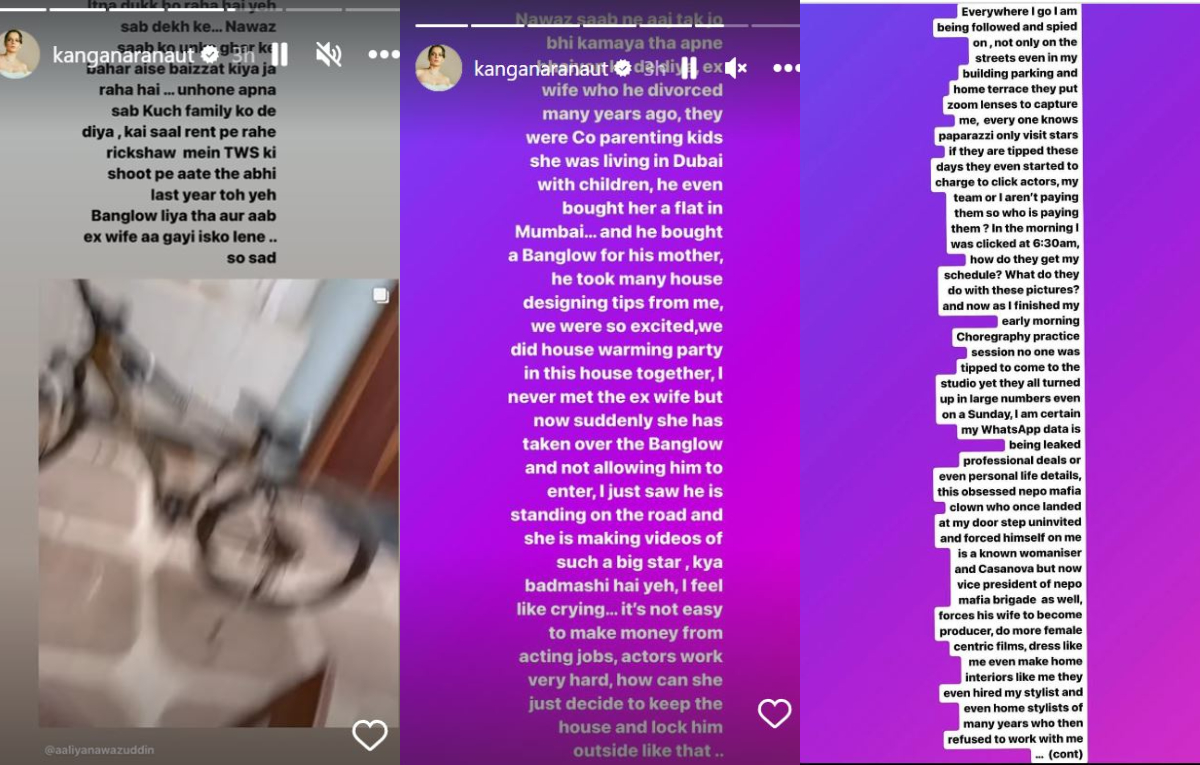आलिया द्वारा शेयर किए गए वीडियो को शेयर करते हुए अपनी इंस्टाग्राम स्टोरी में नवाजुद्दीन की हालत पर कंगना ने रिएक्ट किया है। उन्होंने लिखा, 'इतना दुख हो रहा है ये सब देख के... नवाज साब को उनके घर के बाहर ऐसे बेइज्जत किया जा रहा है... उन्होंने अपना सबकुछ फैमिली को दे दिया, कई साल रेंट पर रहे, TWS की शूट पर रिख्शा में आते थे। तभी लास्ट ईयर तो ये बंगला? बुरा लग रहा है ये सब देख कर... बहुत बुरा।' बता दें कि TWS नवाजुद्दीन सिद्दीकी की अपकमिंग फिल्म 'टीकू वेड्स मनु है'।