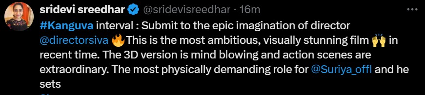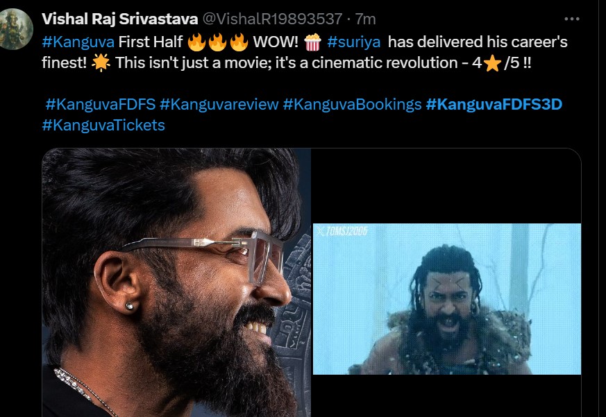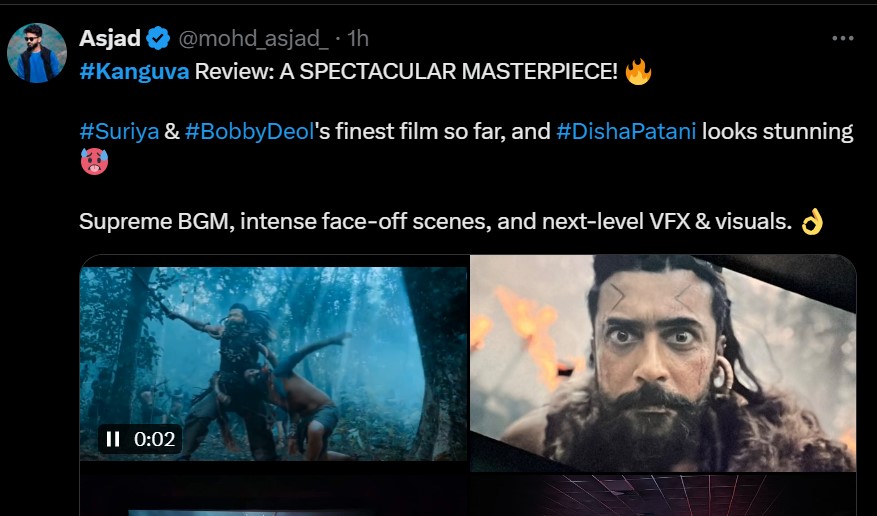 रिलीज के पहले ही दिन और शो के आधार पर कंगुवा को फैंस की तरफ से पॉजिटिव रिस्पॉन्स मिल रहा है। एक्स पर कंगुवा के रिव्यू को लेकर एक तरह से बाढ़ आ गई है। एक यूजर ने कंगुवा को देखने के बाद अपने ऑफिशियल एक्स हैंडल पर ट्वीट कर लिखा है-