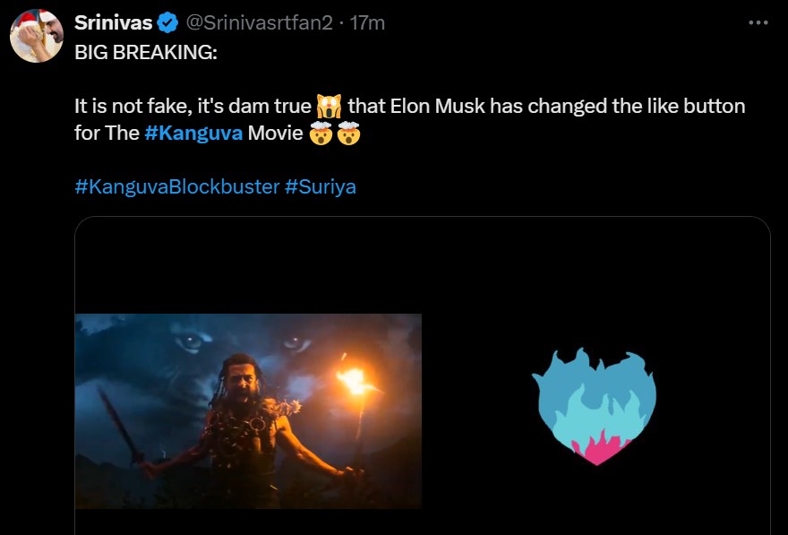 इसके अलावा एक अन्य यूजर्स ने इस बात की जानकारी दी है कि कंगुवा की खातिर बिजनेसमैन और एक्स के मालिक एलन मस्क ने लाइक बटन को बदल डाला है, जो एक इंडियन फिल्म के नाते बहुत बड़ी बात है। दूसरे यूजर ने लिखा है-
