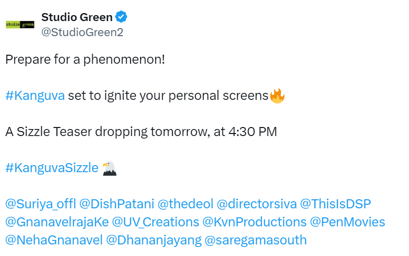 मेकर्स ने फैंस की एक्साइटमेंट को बढ़ाते हुए बताया कि इसका टीजर कल यानी 19 मार्च को आने वाला है। कंगुवा के निर्माता स्टूडियो ग्रीन ने एक पोस्ट किया, जिसमें लिखा गया था कि कल शाम 4:30 बजे टीजर आने वाला है। ऐसे में यह अंदाजा लगाया जा सकता है कि इसके टीजर में फैंस को आकर्षक शॉट्स और वीएफएक्स देखने को मिलने वाले हैं।