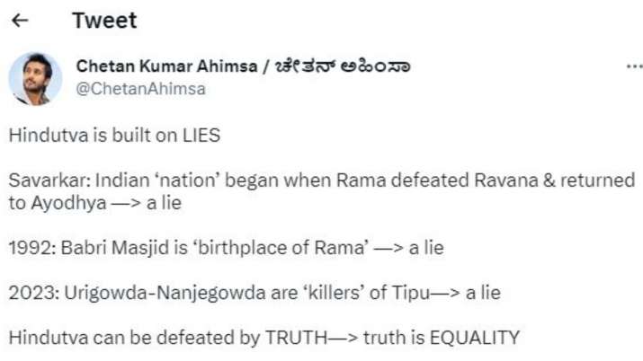 चेतन कुमार एक्टिंग के साथ विभिन्न मुद्दों पर अपनी बेबाक राय रखने के लिए जाने जाते हैं। पहले भी एक्टर अपनी बयानबाजी के लिए कानूनी पचड़े में फंस चुके हैं। इस बार उनके निशाने पर हिंदुत्व आया। चेतन ने अपने ट्वीट में लिखा, "हिंदुत्व झूठ पर बना है...। सावरकर: भारतीय 'राष्ट्र' तब शुरू हुआ जब राम ने रावण को हराया और अयोध्या लौटे- एक झूठ है। 1992: बाबरी मस्जिद 'राम की जन्मभूमि' है- एक झूठ है। 2023: उरीगौड़ा- नानजेगौड़ा टीपू के 'हत्यारे' हैं- एक झूठ है। हिंदुत्व को सत्य से हराया जा सकता है- सत्य समानता है।"