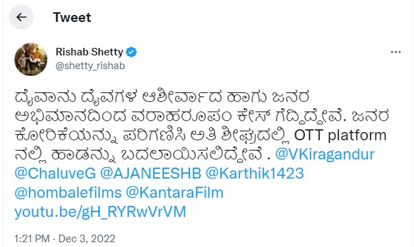 शनिवार को ब्लॉकबस्टर फिल्म 'कांतारा' के निर्देशक और अभिनेता ऋषभ शेट्टी ने सोशल मीडिया अकाउंट पर ट्विटर पर अपनी ये खुशी फैंस के साथ शेयर की। उन्होंने ट्वीट करते हुए लिखा, 'हमने भगवान के आशीर्वाद और लोगों के प्यार से वराह रूपम का केस जीत लिया है। हम लोगों की दरख्वास्त को सराखों पर रखते हुए जल्द ही ओटीटी प्लेटफॉर्म पर गाना चेंज कर देंगे'। आपको बता दें कि बीते महीने यानी कि 24 नवंबर को ही इस फिल्म को अमेजन प्राइम वीडियो पर रिलीज किया गया था। जब इस फिल्म को ओटीटी प्लेटफॉर्म पर रिलीज किया गया तो गाने पर लगे चोरी के आरोप और कोर्ट केस की वजह से फिल्म में से 'वराहरूपम' गाने को हटा दिया गया। इस गाने को ओटीटी रिलीज में न डालने की वजह से मेकर्स को सोशल मीडिया पर फैंस की खासी नाराजगी झेलनी पड़ी थी।
