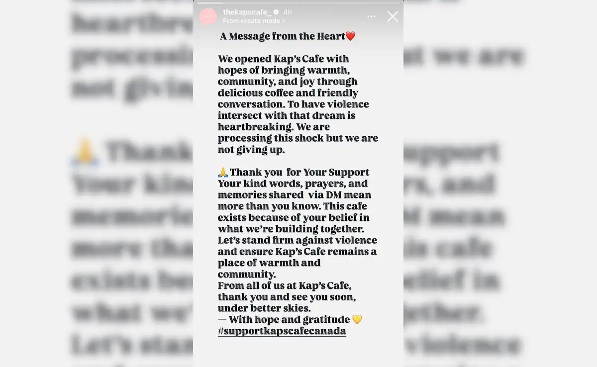 कप्स कैफे में हम सभी की ओर से, धन्यवाद और जल्द ही बेहतर आसमान के नीचे आपसे मुलाकात होगी।"एक स्टोरी में कप्स कैफे ने सरे पुलिस और डेल्टा पुलिस का उनके तुरंत एक्शन और सभी की सेफ्टी को लेकर आभार व्यक्त किया।