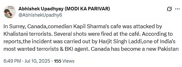 पत्रकार ने ट्वीट किया,"विश्व प्रसिद्ध कॉमेडियन कपिल शर्मा के नए रेस्टोरेंट कप्स कैफे पर कल रात सरे, ब्रिटिश कोलंबिया, कनाडा में गोलीबारी हुई। बीकेआई के एक सदस्य और एनआईए (भारत) के मोस्ट वांटेड आतंकवादी हरजीत सिंह लाडी ने कपिल शर्मा की कुछ टिप्पणियों का हवाला देते हुए इस गोलीबारी की जिम्मेदारी ली है।"