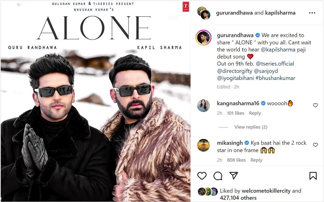 गुरु रंधावा ने ब्लैक स्वेटर, मैचिंग कोट पहन रखा हैं। उन्होंने भी डार्क सनग्लासेस लगा रखा है। यह गाना 9 फरवरी को रिलीज होगा। इसके साथ उन्होंने कैप्शन में लिखा है, 'हम आप लोगों के साथ अलोन की घोषणा करने को लेकर उत्साहित है। मैं इसे दुनिया को सुनाने को लेकर उत्सुक हूं। कपिल शर्मा पाजी का डेब्यू सॉन्ग होगा। यह गाना 9 फरवरी को रिलीज होगा।' इसके अलावा उन्होंने इसे कई लोगों को टैग भी किया है। इस पर मीका सिंह ने प्रतिक्रिया देते हुए लिखा है, 'क्या बात है 2 रॉक स्टार एक फ्रेम में।'