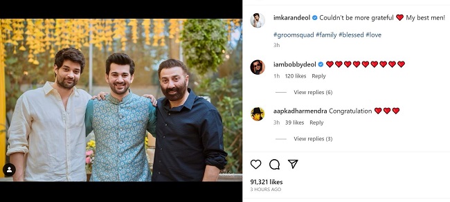 करण देओल ने भी प्री-वेडिंग सेलिब्रेशन की तस्वीरें सोशल मीडिया पर शेयर की है। इसमें उन्हें अपने पिता सनी देओल और भाई राजवीर देओल के साथ देखा जा सकता है। उन्होंने तस्वीरें शेयर करते हुए लिखा है,