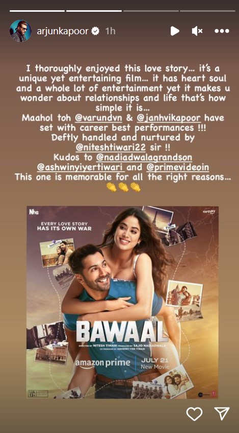 'बवाल' के प्रीमियर में अर्जुन कपूर, करण जौहर, राधिका मदान, मनीष पॉल सहित कई सितारे पहुंचे। अपनी बहना जाह्नवी की फिल्म देखने के बाद अर्जुन कपूर ने बताया कि उन्हें फिल्म और उनकी परफॉर्मेंस कैसी लगी। 'हाल्फ गर्लफ्रेंड' एक्टर ने कहा, ''मैंने इस फिल्म को बहुत इंजॉय किया...यह यूनिक और बहुत दिलचस्प फिल्म है, जो रिलेशनशिप और लाइफ के बारे में सोचने पर मजबूर करती है।'' उन्होंने इस फिल्म को वरुण धवन और जाह्नवी कपूर की बेस्ट परफॉर्मेंस बताया है।