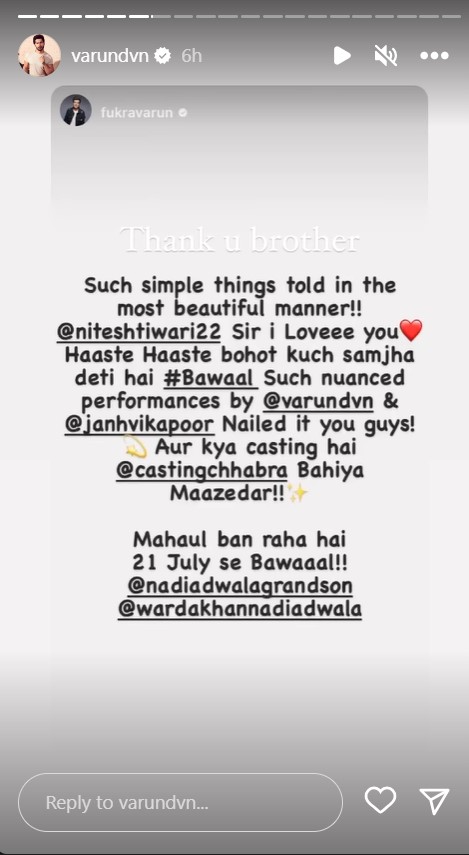 फुकरा इंसान यानी कि अभिषेक मल्हान के सोशल मीडिया अकाउंट से भी फिल्म का रिव्यू किया गया है। उन्होंने कहा कि कितने सिंपल तरीके से कुछ चीजों को दिखाया गया है। हंसते-हसंते बहुत कुछ समझा देती है बवाल। वरुण धवन और जाह्नवी कपूर ने बहुत अच्छी परफॉर्मेंस दी है। उन्होंने कास्टिंग की तारीफ करने के साथ ही कहा कि 'बवाल' को लेकर माहौल बन रहा है।