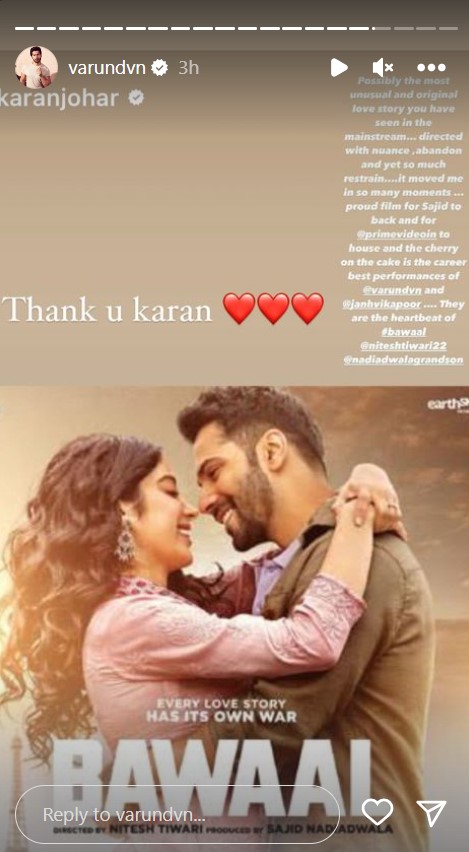 'रॉकी और रानी की प्रेम कहानी' के डायरेक्टर करण जौहर को भी 'बवाल' पसंद आई है। उन्होंने फिल्म के रिव्यू में कहा, ''मेनस्ट्रीम में देखी गई अब तक की सबसे ऑरिजनल लव स्टोरी है। बारीकी से इसे डायरेक्ट किया गया है।'' उन्होंने भी इसे वरुण और जाह्नवी के करियर की बेस्ट परफॉर्मेंस बताया है।