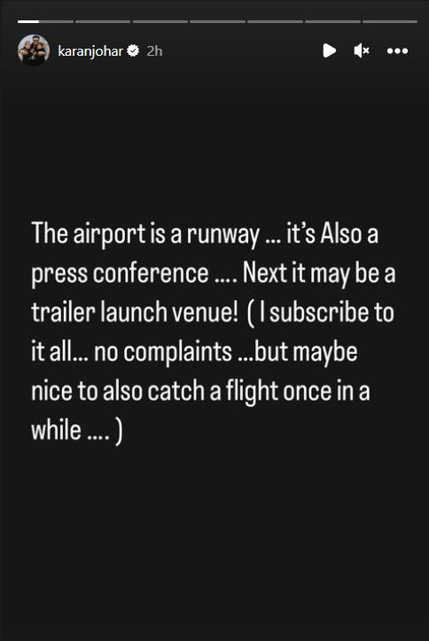 करण जौहर ने अपनी इंस्टा स्टोरी में पोस्ट शेयर करते हुए कहा, "एयरपोर्ट एक रनवे है...यहां प्रेस कॉन्फ्रेंस भी होती है...अब अगली बार शायद ट्रेलर लॉन्च भी होगा (मैं इन सबका हिस्सा बनूंगा...कोई शिकायत नहीं है...लेकिन कभी-कभी फ्लाइट पकड़ लेना भी थोड़ा अच्छा होगा।"