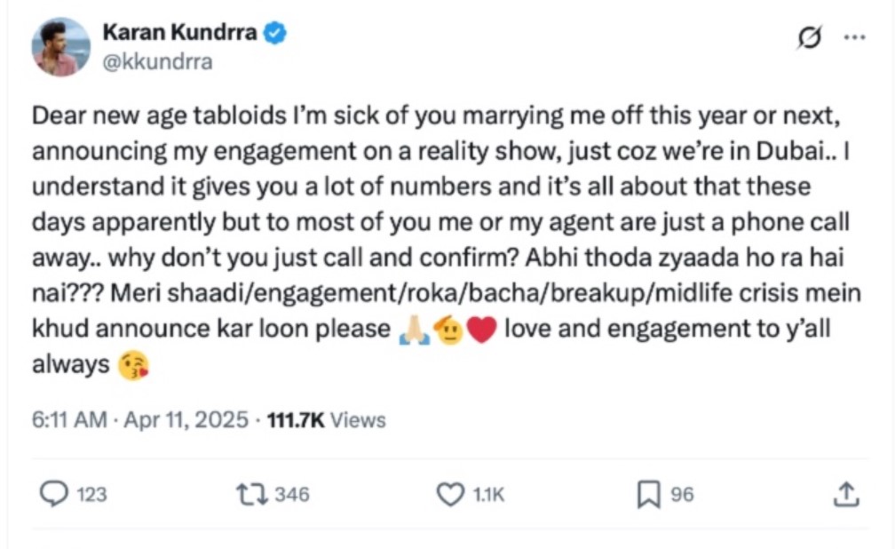पिछले दिनों ये खबर आ रही थी कि दुबई ब्लिंग नाम के रियलिटी शो में दोनों सगाई करने वाले हैं। अब करण ने इस अफवाह पर रिएक्ट किया है। एक्स पर एक्टर ने लिखा, नई उम्र के टैब्लॉइड्स, मैं परेशान हो चुका हूं अपनी शादी की खबरों को लेकर जो आप इस साल करवाने वाले हो। मैं रियलिटी शो में सगाई अनाउंस करने वाला हूं क्योंकि मैं दुबई में हूं। ऐसा नहीं है। मैं समझता हूं कि आप लोग ढेर सारे नंबर बना रहे हैं और इन दिनों बस एक यही बात रह भी गई है।