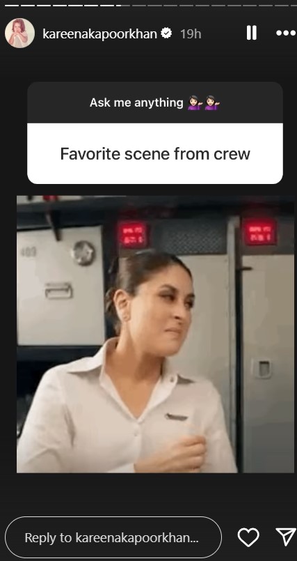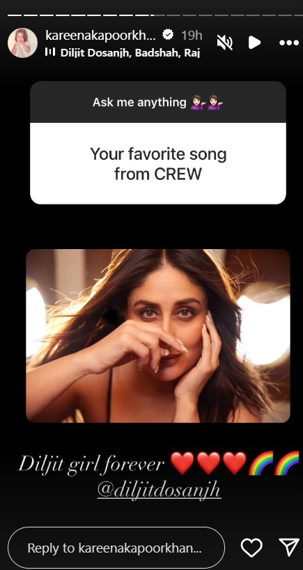 करीना से एक फैन ने पूछा कि 'क्रू' से उनका पसंदीदा गाना कौन सा है। उन्होंने 'नैना' सॉन्ग से अपनी फोटो शेयर कर लिखा, 'दिलजीत गर्ल फॉरेवर।'