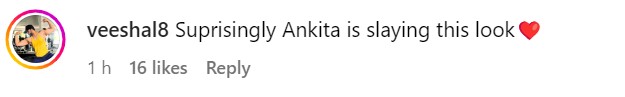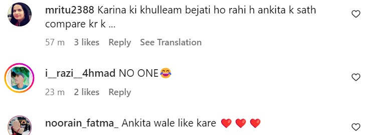 एक यूजर ने कमेंट कर लिखा है- हैरान करने वाला है, लेकिन अंकिता इस लुक में ज्यादा अच्छी लग रही हैं। दूसरे यूजर ने लिखा है- करीना कपूर की तुलना में अंकिता लोखंडे काफी शानदार दिख रही हैं।