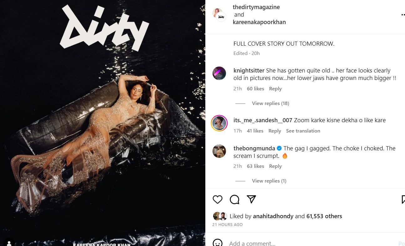 डर्टी मैगजीन के लिए किया गया कर फोटोशूट करीना के कुछ फैंस को पसंद नहीं आया। एक यूजर ने लिखा, 'यह वाकई में बूढ़ी होने लगी हैं। इनकी लोअर जॉलाइन अब कितनी बड़ी दिखती है।' एक अन्य यूजर ने कहा, 'वाकई में डर्टी फोटोशूट है। करीना के लुक्स के साथ कितना कुछ किया जा सकता था।'